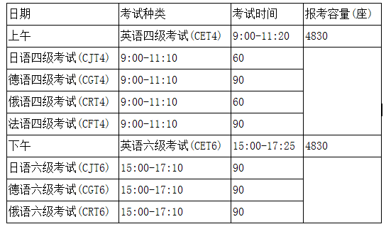 2019年上半年CET考试时间为2019年6月15日,各科目考试具体时间及报考容量如下: