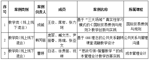 根据山东省高等学校课程联盟发布的《关于开展2023年度优秀案例评选活动的通知》(鲁课联盟〔2023〕6号),学校开展了优秀案例评选工作。经学院推荐、专家评审,拟确定成铖负责的“基于‘三大场域’真实性学习模式的《国际贸易惯例与规则》教学创新与实践”等3项教学类案例参与山东省高等学校课程联盟优秀案例的评选。具体名单如下: