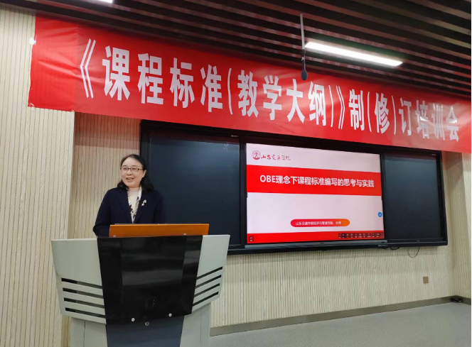 会上,山东交通学院孙烨教授作了题为《OBE理念下课程标准编写的思考与实践》的报告。孙教授结合专业认证要求,详细讲解了OBE理念下专业人才培养体系的构建逻辑、OBE理念下课程标准的地位、及如何基于OBE理念编写课程标准(教学大纲)。她强调,课程标准是准绳、尺子,一切有关课程的活动都应基于课程标准展开。她结合经济管理类专业几门课程的具体案例,对照我校本次课程标准(教学大纲)制修订模版中的关键点,分析了制(修)订中的注意事项,并强调在课程标准(教学大纲)制(修)订的过程中应注意反向设计、正向实施,评价反馈、持续改进,做到可评、可测、可教、可学、可管,实现知识目标、能力目标、素质目标的统一,充分体现学生中心、产出导向的理念。