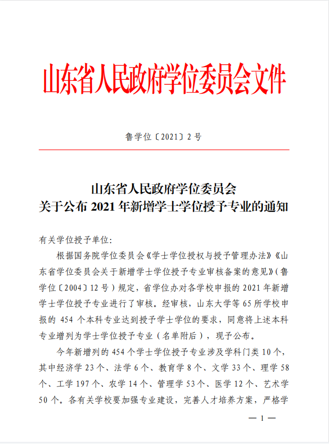 其中,根据《山东省人民政府学位委员会关于公布 2021 年新增学士学位授予专业的通知》,我校2021年新增11个学士学位授予专业,分别为法语、旅游管理、物业管理、资产评估、德语、朝鲜语、思想政治教育、数据科学与大数据技术、日语、阿拉伯语、健康服务与管理。至此,我校经教育部批准(备案)的专业共42个,具有学士学位授予权的专业共36个。各学院各专业要持续加强课程、专业建设,严格执行人才培养方案,保证人才培养质量。